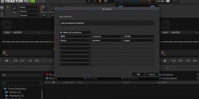 Se comporta exactamente como podría esperar: agregue hasta 8 condiciones que una pista debe coincidir para agregarse automáticamente a su lista de reproducción inteligente y completará automáticamente la lista de reproducción inteligente. Vale la pena mencionar que las pistas parecen tener que agregarse a su colección Traktor para aparecer en una lista inteligente; por lo tanto, si está acostumbrado a usar solo la integración de iTunes, deberá importarlos.