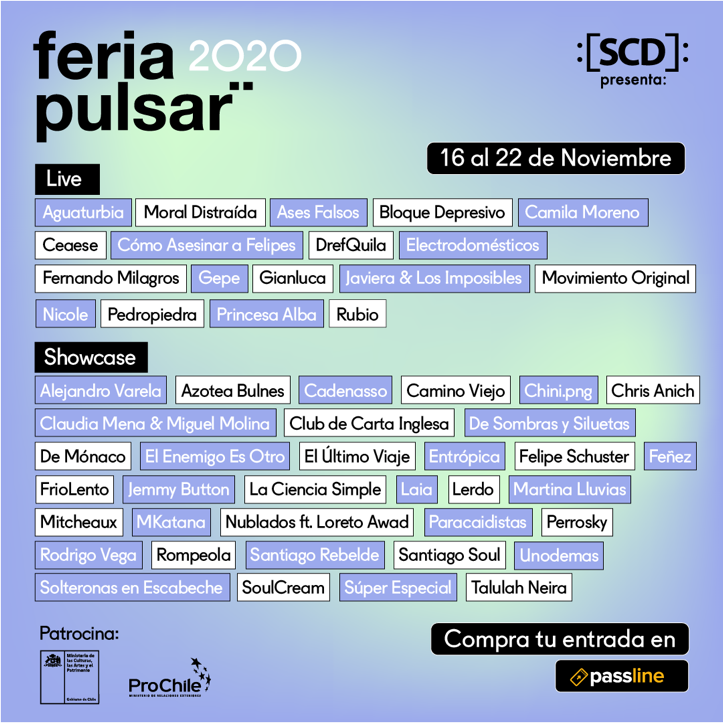 Desde este lunes 16 hasta el domingo 22 de noviembre, Feria Pulsar realizará su esperada edición 2020, en un formato que promete ir más allá en el universo online, de la mano de un completo mercado de la música y shows de alto nivel transmitidos desde Estación Mapocho, además de los showcases que serán emitidos entre el lunes 16 y el jueves 19 de noviembre desde la Sala SCD Bellavista.