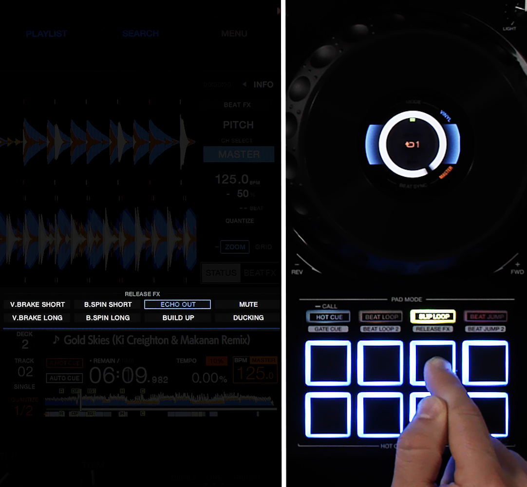 Al presionar los Performance Pads, puede cambiar instantáneamente la energía de su interpretación, ya sea que desee agregar dramatismo a una sección de una pista o crear un momento emocionante antes de pasar a otra canción en el otro deck. Por ejemplo, puede usar Echo Out o Spin Out para mezclar dinámicamente en su siguiente pista. Elija entre 8 tipos de efectos: freno de vinilo (corto / largo), retroceso (corto / largo), salida de eco, acumulación, silencio y agachado.